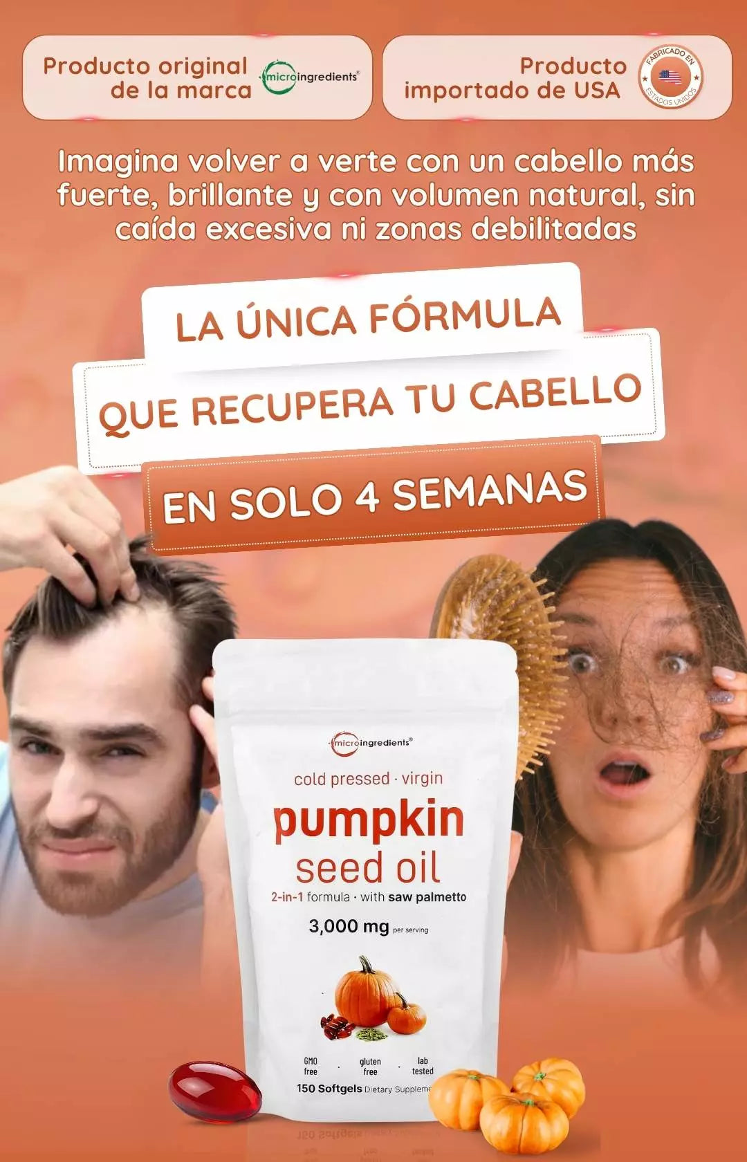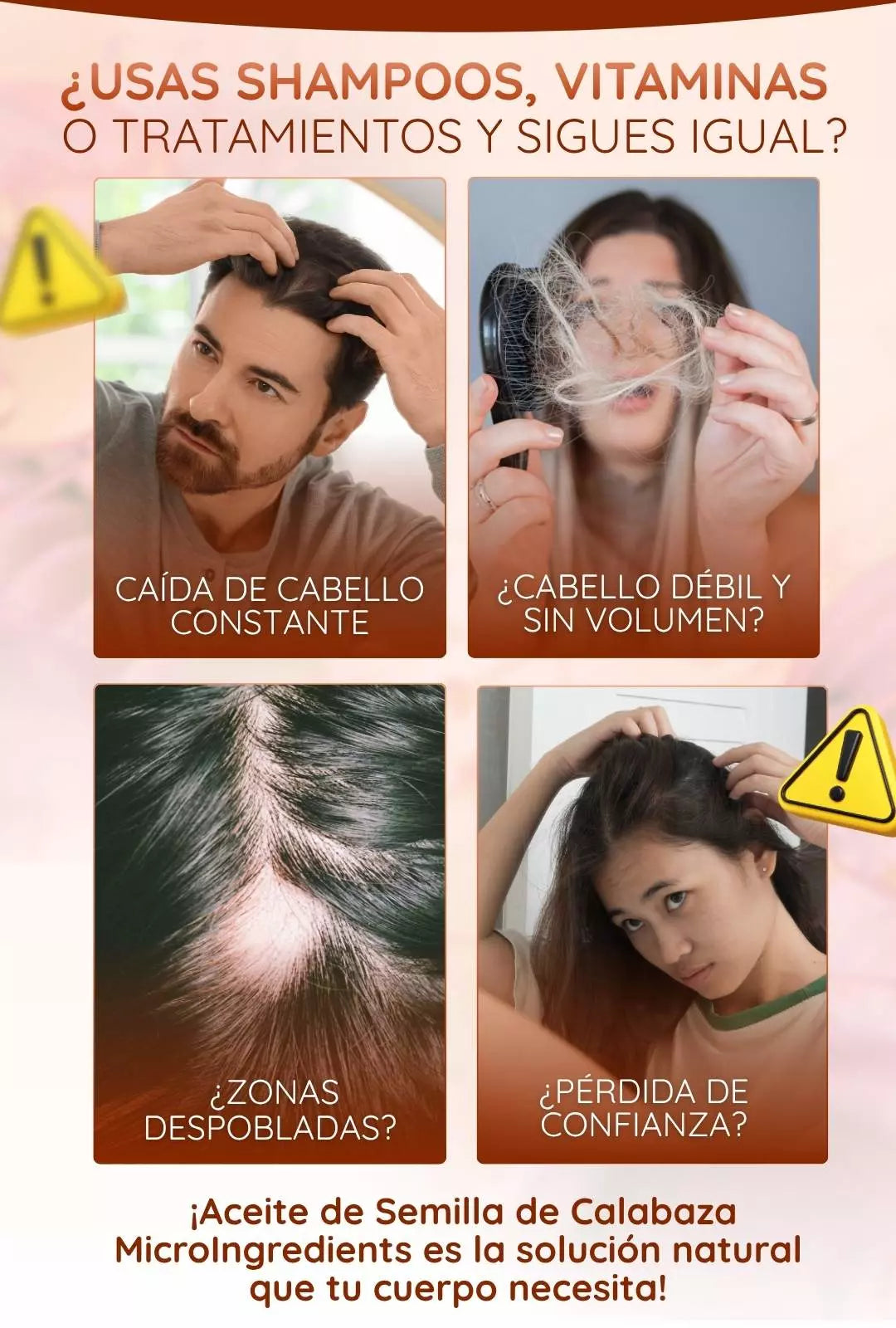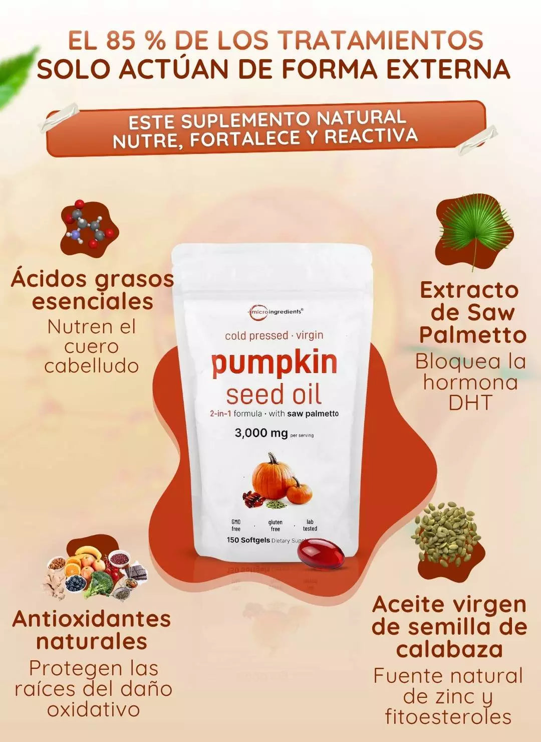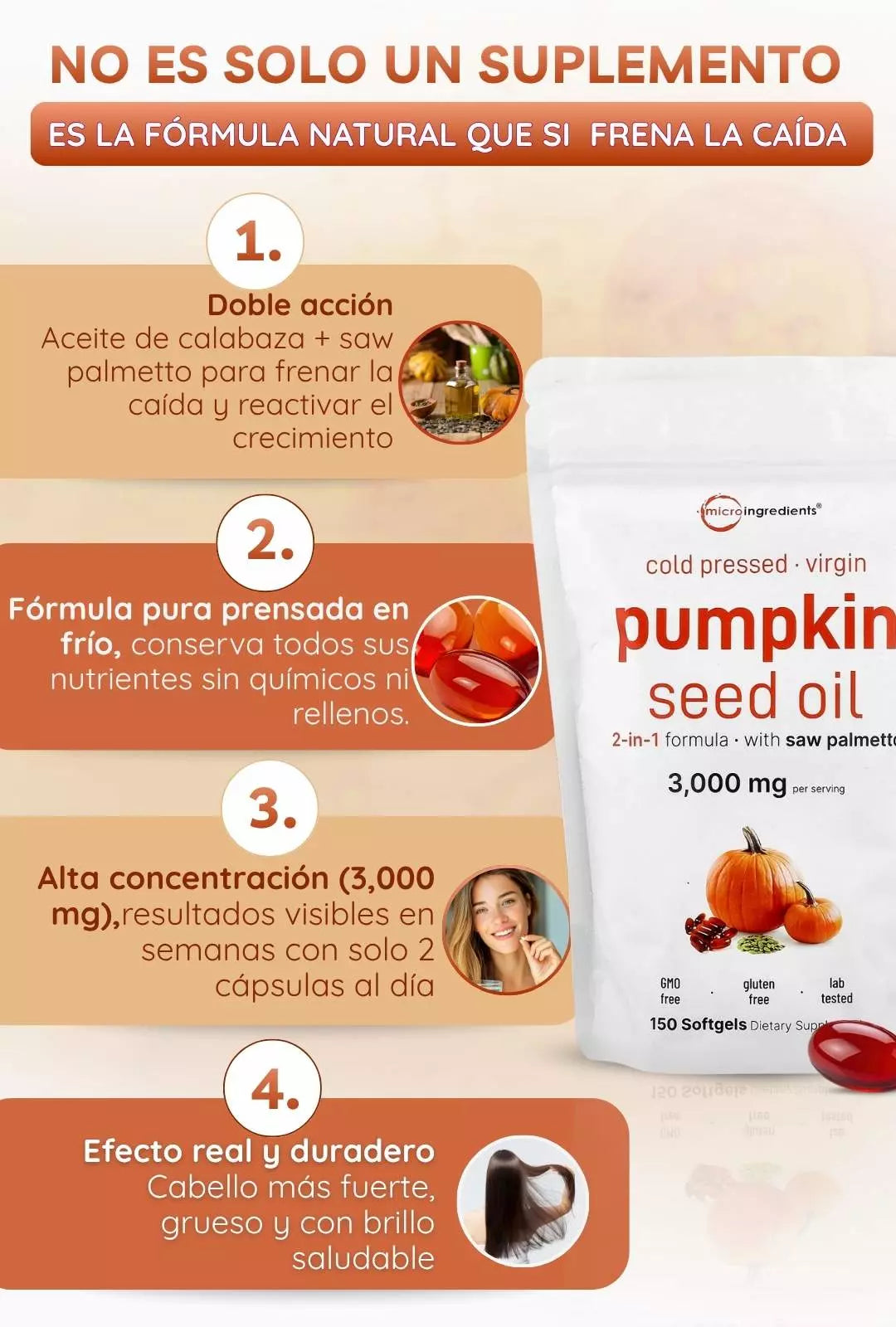 Comienza a notar mejoras en 3 a 5 semanas de uso constante En estudios de aceite de semilla de calabaza se observaron mejoras capilares a las desde las primeras 4 semanas