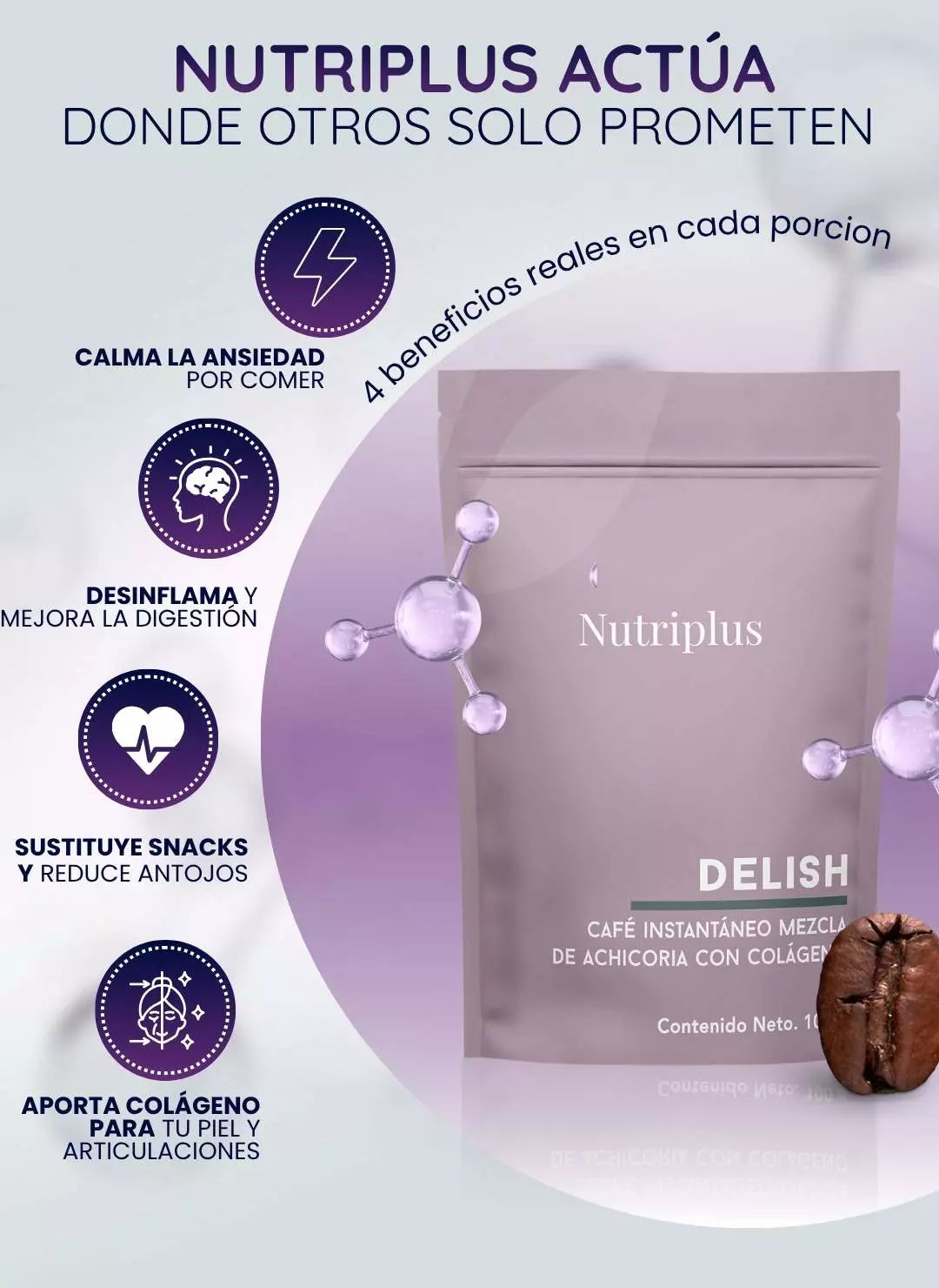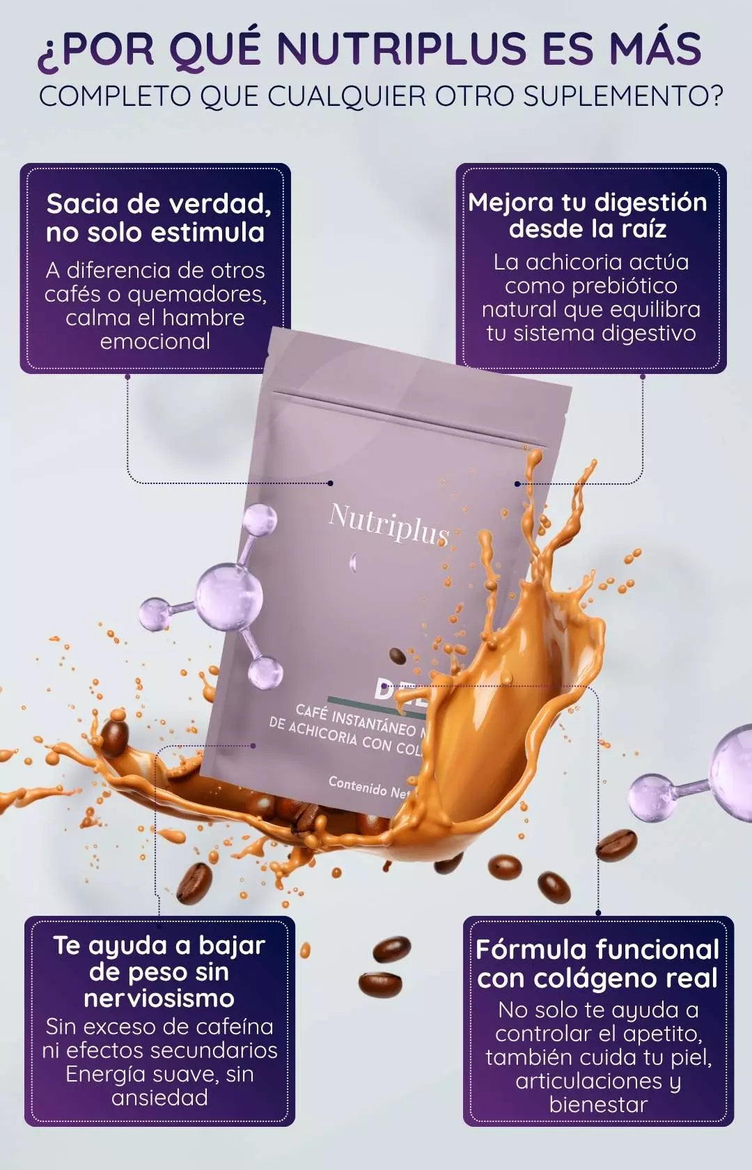 Contiene café instantáneo y raíces de achicoria — así que si eres muy sensible a la cafeína o tienes alergias a colágeno o ciertos ingredientes, conviene consultar. Tampoco está pensado como sustituto total de la alimentación o para “tratar” enfermedades